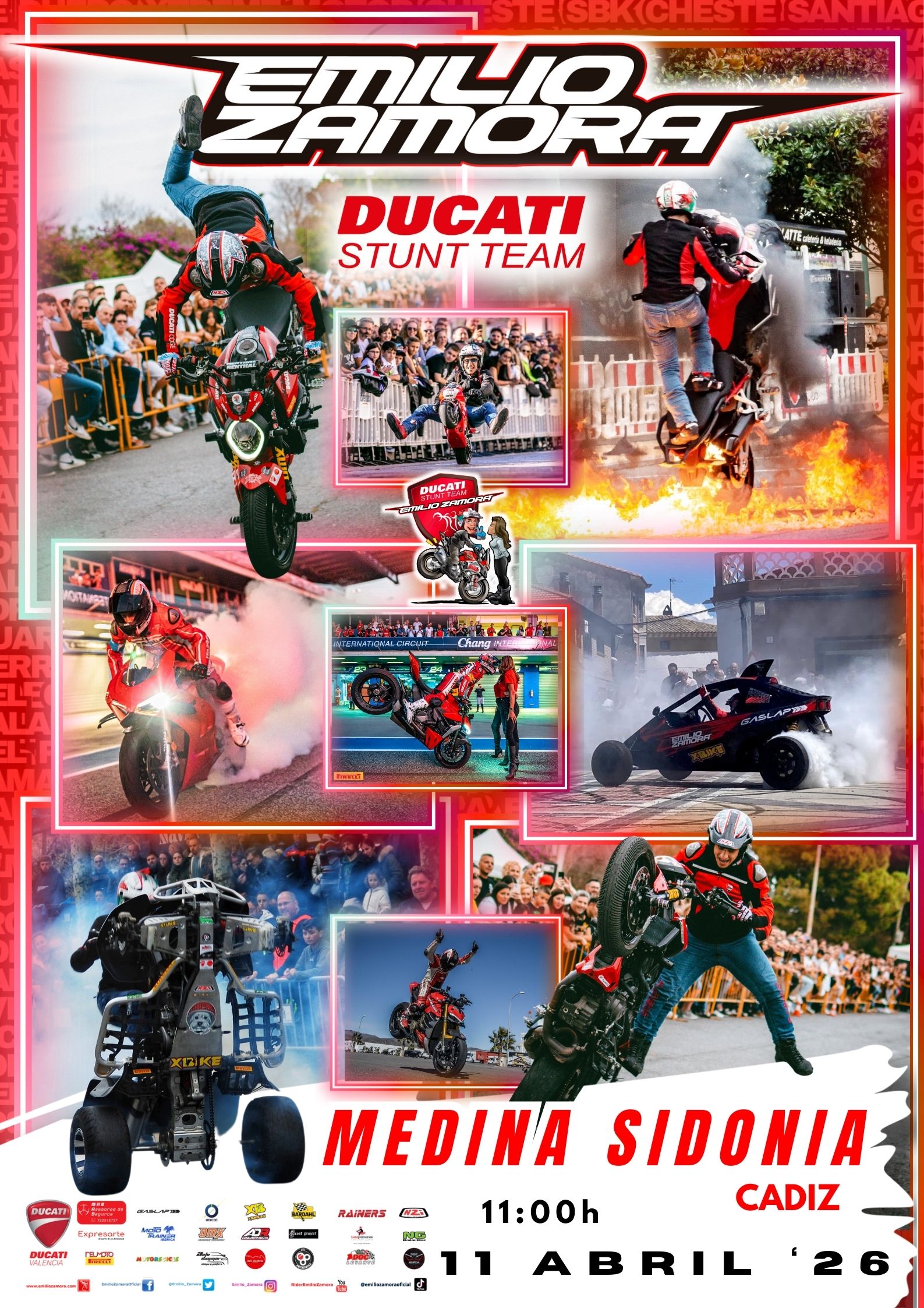 Contaremos con el mismísimo Emilio Zamora, piloto internacional de Ducati Stunt Team, que nos dejará con la boca abierta con sus trucos imposibles, derrapadas y piruetas al límite en un show único.